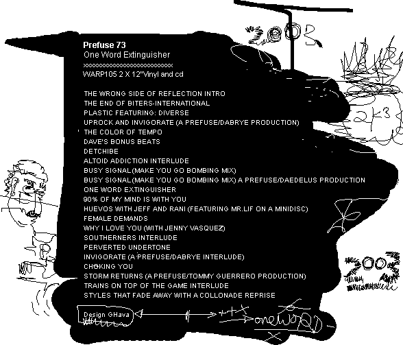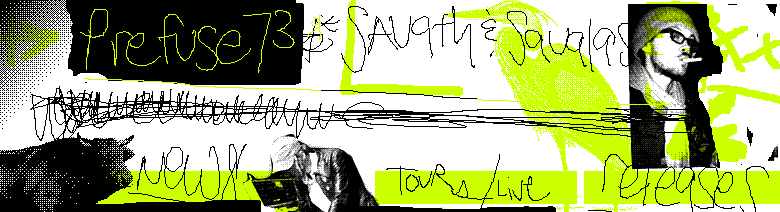 HEIR OF THE CREEP DOG THAT BIT YOUR ASS- by Dave Tompkins Some folks make beats. Others make beats chuzzle a fifth of Knob Tweak and stutter like torquey pig. Scott Herren does both at the same time and can still drive home on point, East Point, Decatur. In 85, the year Buff of the Fat Boys made speakers blow like fuzack, Scott was in 4th Grade watching his friend beatbox Inspector Gadget, turning bathroom into Echoplex. Nice-nice acoustics. Oh what gadget, fidget and "Bllll-stick ’em" have done for blipsters and every jiggabit sub genre this side of a side effect. One sound repeated, chunked, rolled and punctuated with a stab. Just like a reflux drill after a bowl of Burt s Chili at the Waffle House, if not a Prefuse 73 song. With his Prefuse 73 debut Uprock Narratives, Scott Herren sort of became, as Nick Cage once said on an escalator in Las Vegas, the kling klang king of the rim ram room. ROM RAM boom? Nonetheless Herren made rhythmic sense of Divine Styler, got close to the edit and chopped beats with a chip-toothed woodchuckle. He also played all the instruments, so it wasn’t like he was just sitting there frying his jock with a laptop. Rap guys liked it because the skinny boy from ATL had caught Mikah 9 in a zone and MF Doom at his farm. People-who-don’t-like-rap-but-think-Dirty-Southis- cool liked it as well. Meanwhile, fans of Glitchass & Lapdog hoed a Herren garden in their Ipods. All of this went swimmingly. Herren made boom bap go zit-zat-zotz, but, and this is a big Oldsmobile but, didn’t put on airs. Rather Air Force Ones. Rough as a Velcro rip and smoother than Lacey Lace’s butter boat. And much smoother than those "big ass posse cuts" Scott had produced back yonder for a crew out of Clarkston, GA, who, unlike most blinguists, would rather not be known. This early lesson in loc fi involved ten scowls, one mic and a 350 pound "adlib guy" full of more hot air than the S.O.S. Band’s blimp. Their song title could be ziplocked as state s evidence but rather-not-be-known did commend Scott on the pimpness of his tinted glasses. Scott said he wore window dimmers so he could see his MPC and computer screen. Either way they clicked curb detector meet gadget inspector, a mad programmer with a heart of crunk. Herren has since left Stankonia for his roots in Barcelona, where he started his own label Eastern Developments and still listens to Cool Breeze. Traded his Plymouth Valiant for a scooter and is going Catalan folk for the next Savath & Savalas album. Yet Prefuse 73 is still the franchise project and he s calling this one One Word Extinguisher. "It’s the one word that would sum up everything," says Scott, who used to jack jelly bracelets from Woolworth s and sell them to girls. "So you could make another person shut up or at least understand. Expect lots of cut-up, R&B ghosts and of course, beatboxing. For The One Word Extinguisher hangs in the hallway outside that school bathroom in Decatur. Ready to go off when the bell goes, "Bllllllllll!!"