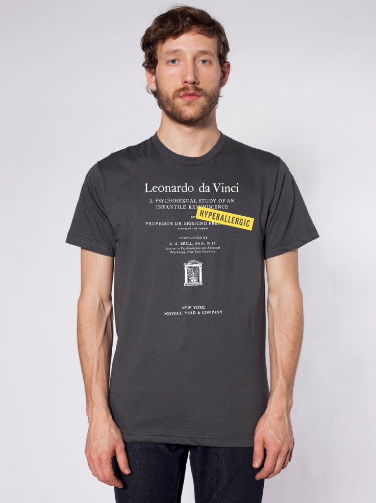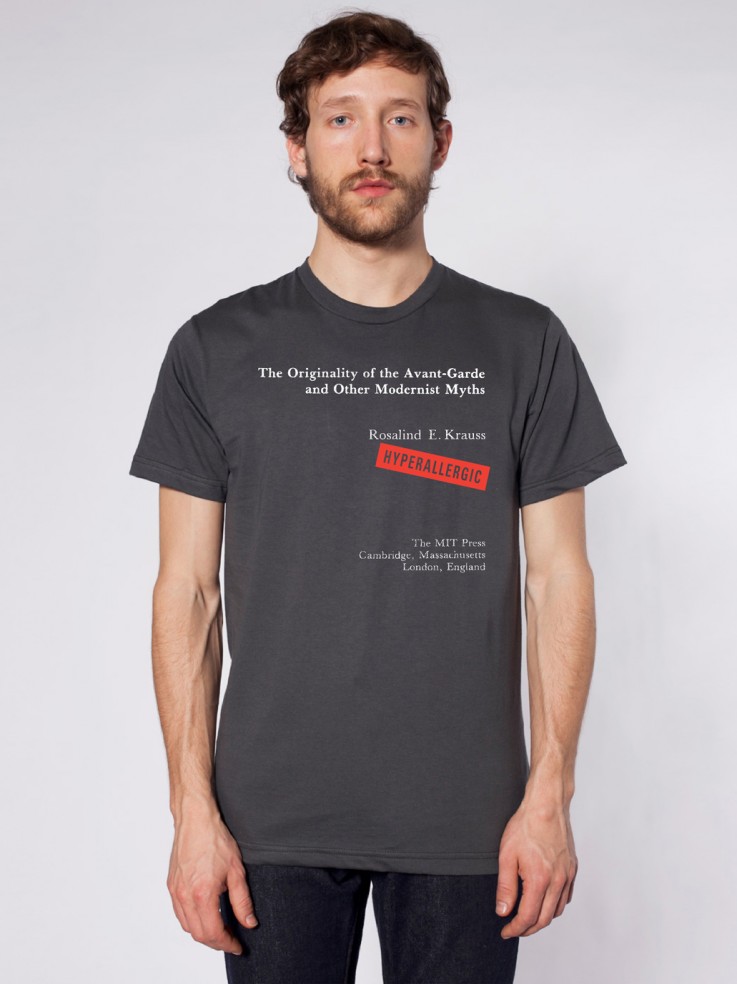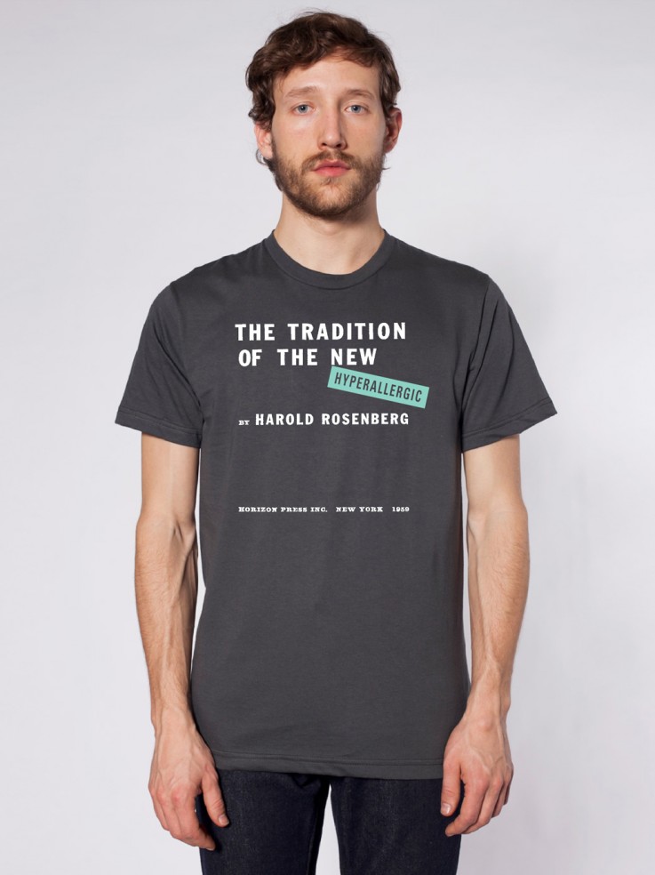 An ongoing series of shirts for Hyperallergic, a Brooklyn art blog, designed to enable the editors to present those books which influenced how they see and write about art. I thought the title pages would be more interesting, especially if we were able to scan older editions—which we were, courtesy of the NYPL. The choice also visually unifies the series since these pages are guaranteed to be strictly typographic.