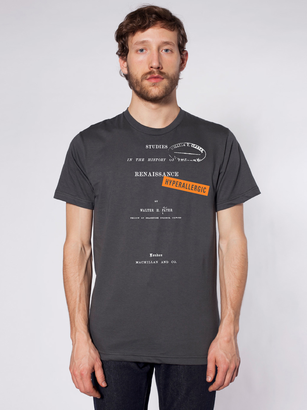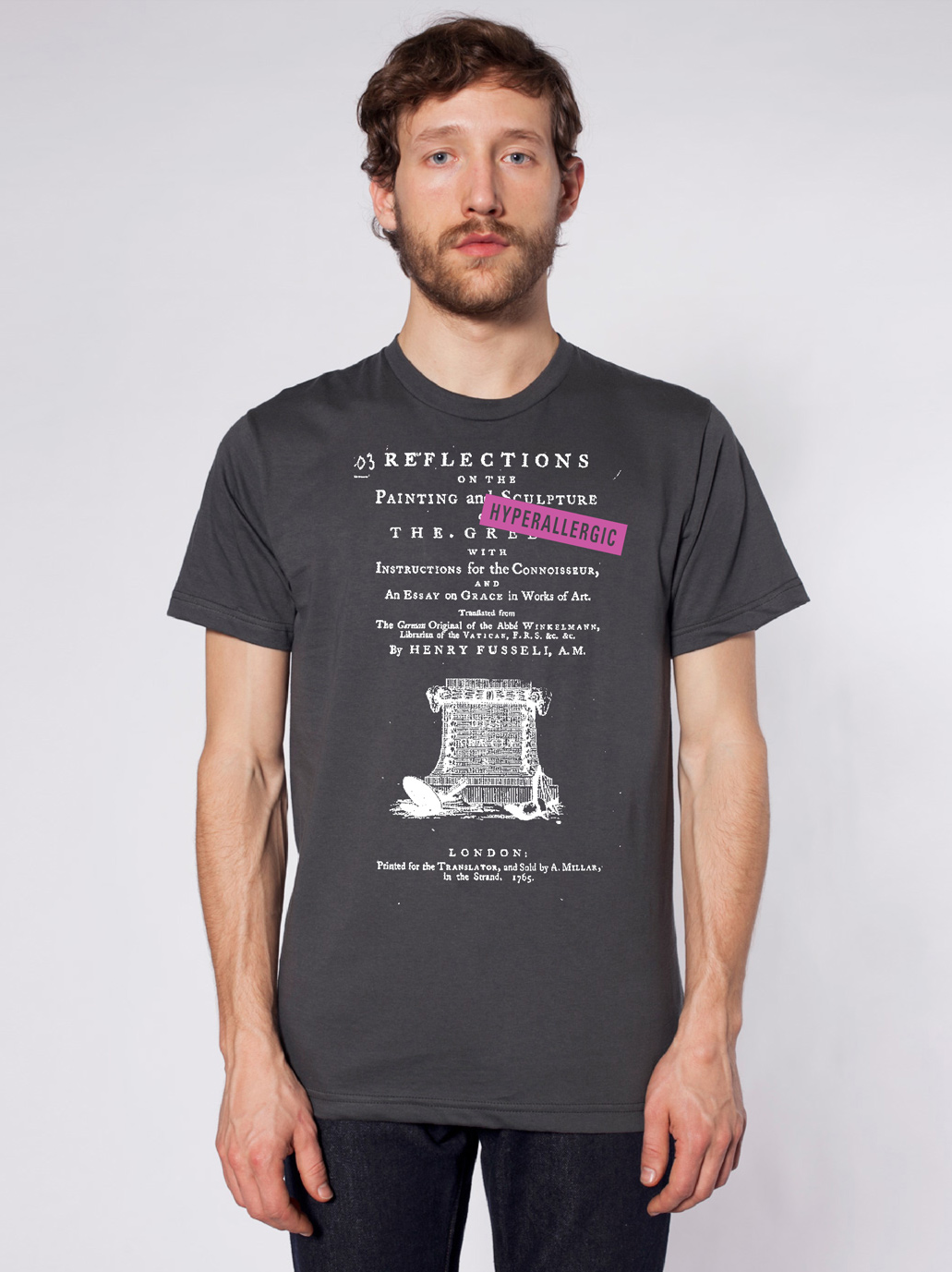 An ongoing series of shirts for Hyperallergic, a Brooklyn art blog, designed to enable the editors to present those books which influenced how they see and write about art. I thought the title pages would be more interesting, especially if we were able to scan older editions—which we were, courtesy of the NYPL. The choice also visually unifies the series since these pages are guaranteed to be strictly typographic.