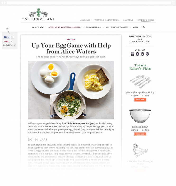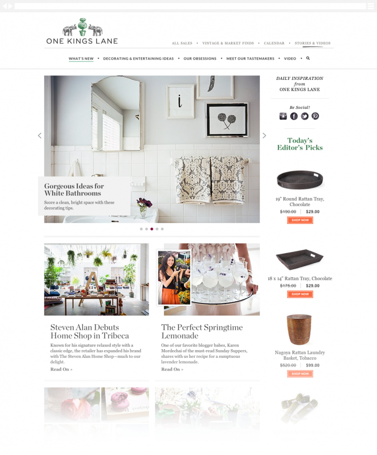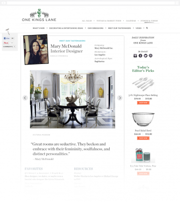 My title at One Kings Lane was Art Director but more accurately my role was a mix of Visual/Product Designer (a Silicon Valley title), editorial designer and brand art director (New York City titles). This multifaceted position exposed me to an interesting array of projects and allowed me to communicate and report to multiple charges, including the VPs of Creative in New York and Editorial, Digital Design and UX Directors in San Francisco. Below are some samples of recent projects.