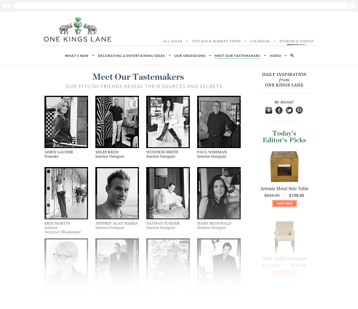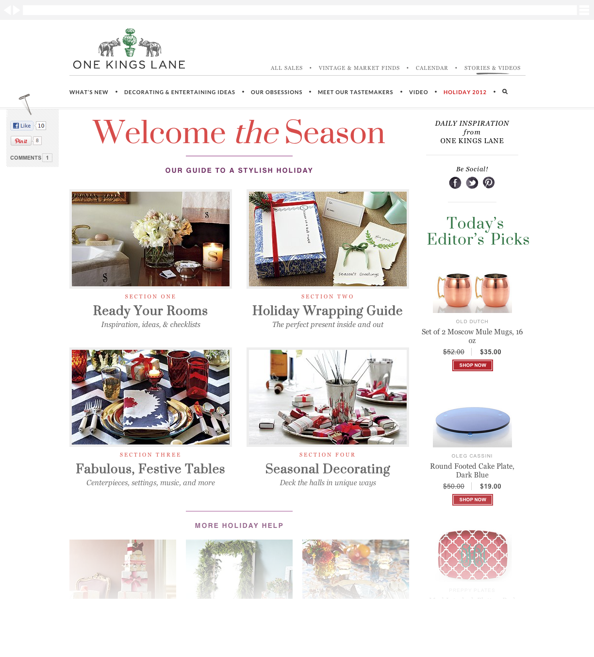My title at One Kings Lane was Art Director but more accurately my role was a mix of Visual/Product Designer (a Silicon Valley title), editorial designer and brand art director (New York City titles). This multifaceted position exposed me to an interesting array of projects and allowed me to communicate and report to multiple charges, including the VPs of Creative in New York and Editorial, Digital Design and UX Directors in San Francisco. Below are some samples of recent projects.