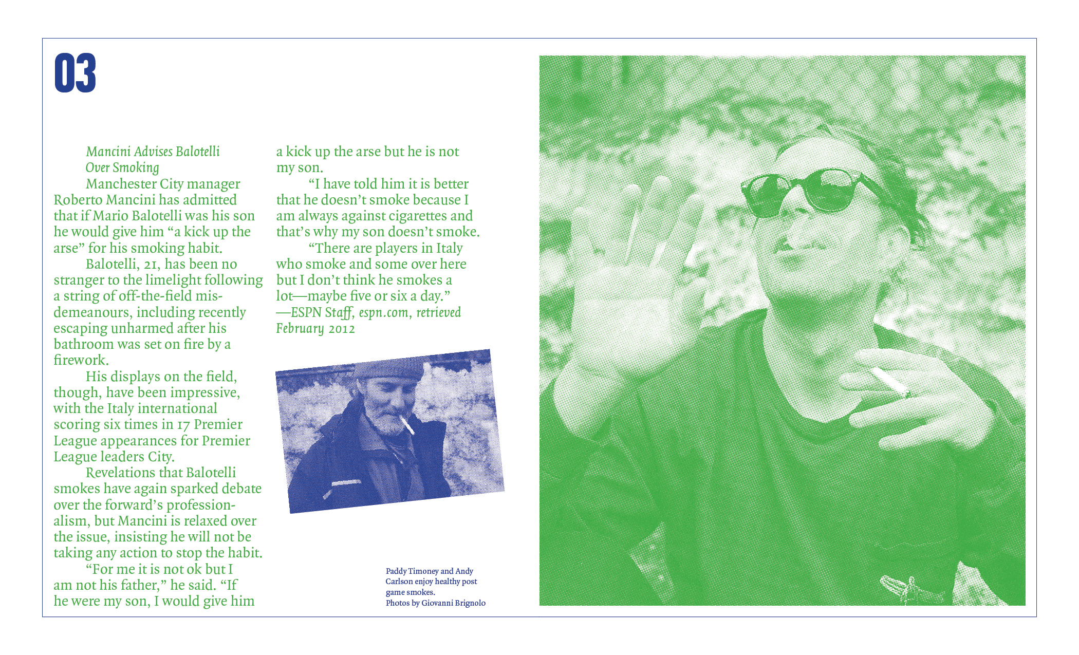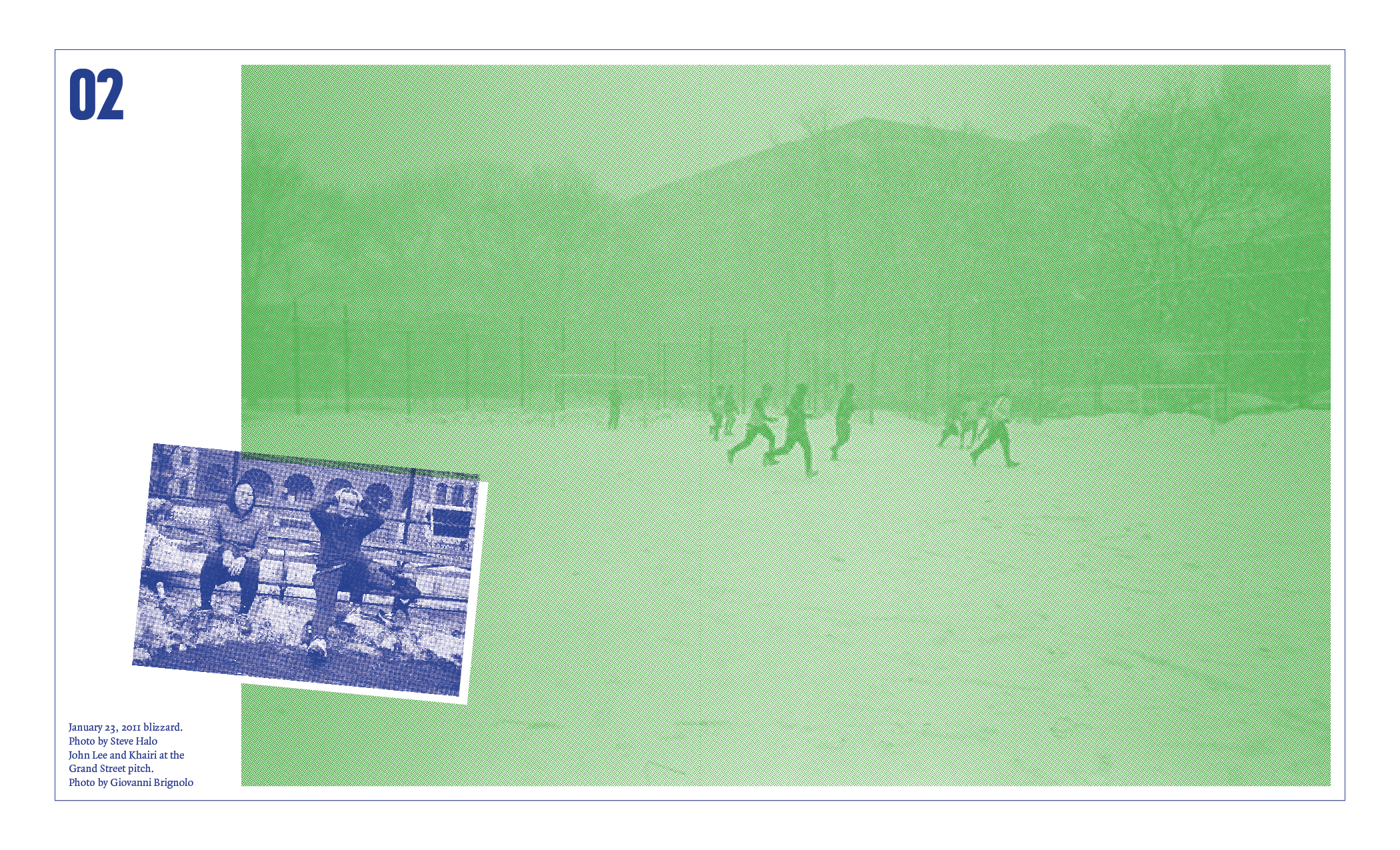 Fan club zine for a soccer club in Manhattan. The trilingual cover references the spoken languages surrounding the club’s home pitches along Chrystie Street. The rules define the page boundaries but are also available to be use for strategical field diagrams. Special mention via Le Journal de la Photographie.