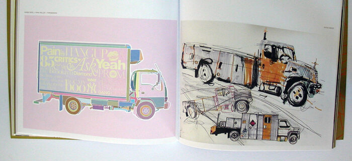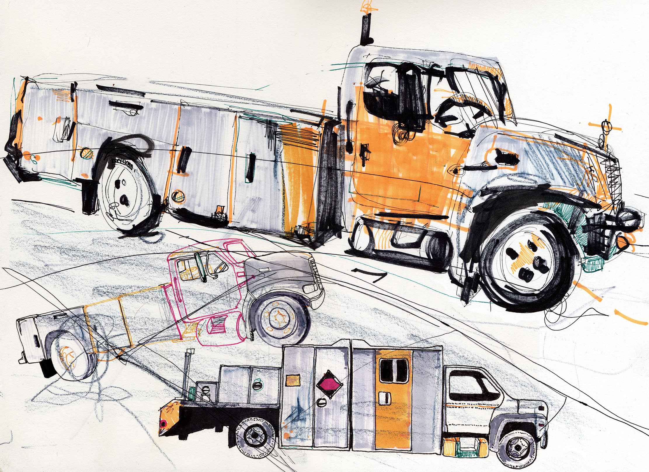 Cody Hudson asked for drawings of delivery trucks facing right for aka’s premier issue. I am not sure if it a magazine or a book. Either way I screwed up the brief by not drawing delivery trucks and not making them face right so thank photoshop. I like the truck Cody put mine next to.